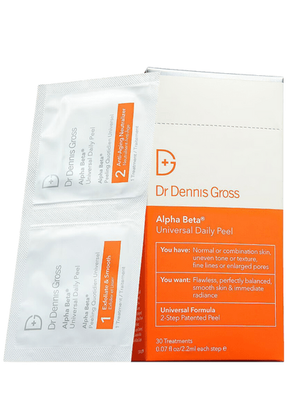 Single use pads – step 1 has five AHA/BHAs to boost radiance, target pores, diminish fine lines while step 2 neutralizes and hydrates. Dr Dennis Gross Alpha Beta Universal Daily Peel, $36.00 to $264.00.